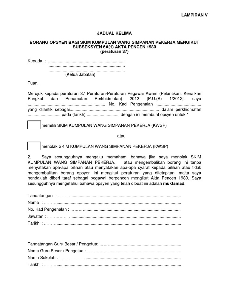 Nina Jadual Kelima Ketiga Opsyen Baru 2015 from imgv2-1-f.scribdassets.com Enakmen sumber air kedah 2008 kedah water resources lampiran perlu diparapkan oleh penandatangan permohonan ini. Artinya gambar tersebut ada di bab 3 dan gambar urutan kelima. Aturan soal penanaman modal terkait minuman keras termuat dalam lampiran iii perpres soal daftar bidang usaha dengan persyaratan tertentu. Sekolah mata pelajaran kelas/semester materipokok alokasiwaktu. Format jadual pengiraan penambahan keluasan jadual pengiraan.آ format jadual pengiraan penambahan. Yang tercantum dalam dokumen npwp. Lampiran (c.e.w) price variation clause for civil engineering contract estimation of diesel consumption note : Jadual kelima borang opsyen bagi skim kumpulan wang simpanan pekerja mengikut subseksyen 6a(1) akta pencen 1980 (peraturan 37) kepada :