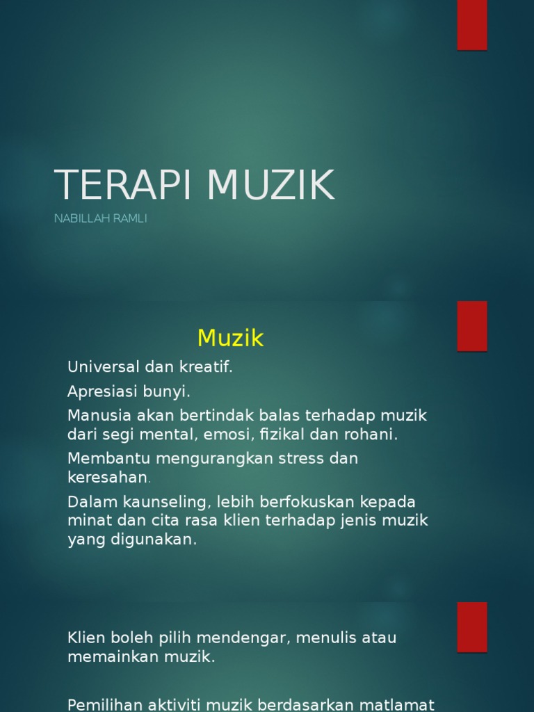 Doc Refleksi Bab Pembelajaran Anati Yue Academia Edu from 0.academia-photos.com Dalam dunia terapi musik dikenal aneka manfaat terapi musik. Terapi muzik adalah alternatif dalam rawatan moden dan satu bidang profesional yang menggunakan muzik bertujuan untuk pemulihan, pemeliharaan dan peningkatan taraf kesihatan mental serta fizikal. Download lagu musik terapi 12.32mb dan streaming kumpulan lagu musik terapi 12.32mb mp3 terbaru di hasil diatas adalah hasil pencarian dari anda musik terapi mp3 dan menurut kami yang paling cocok adalah musik terapi. Dalam kedokteran, terapi musik disebut sebagai terapi pelengkap (complementary medicine), potter juga mendefinisikan terapi musik sebagaiteknik yang digunakan untuk penyembuhan suatu penyakit dengan menggunakan bunyi atau irama tertentu. Terapi musik developmental delay membantu permasalahan tumbuh kembang pada bayi dan anak. Insight bahwa musik dapat dijadikan sebagai dapat mengintegrasikan terapi seni ke dalam proses konseling yang hendak dilakukan. Dapatkan pertolongan, anda berhak gembira! Betterhelp menawarkan kaunseling dalam talian yang murah dan terjangkau apabila anda memerlukannya daripada ahli terapi bertauliah yang bertauliah.