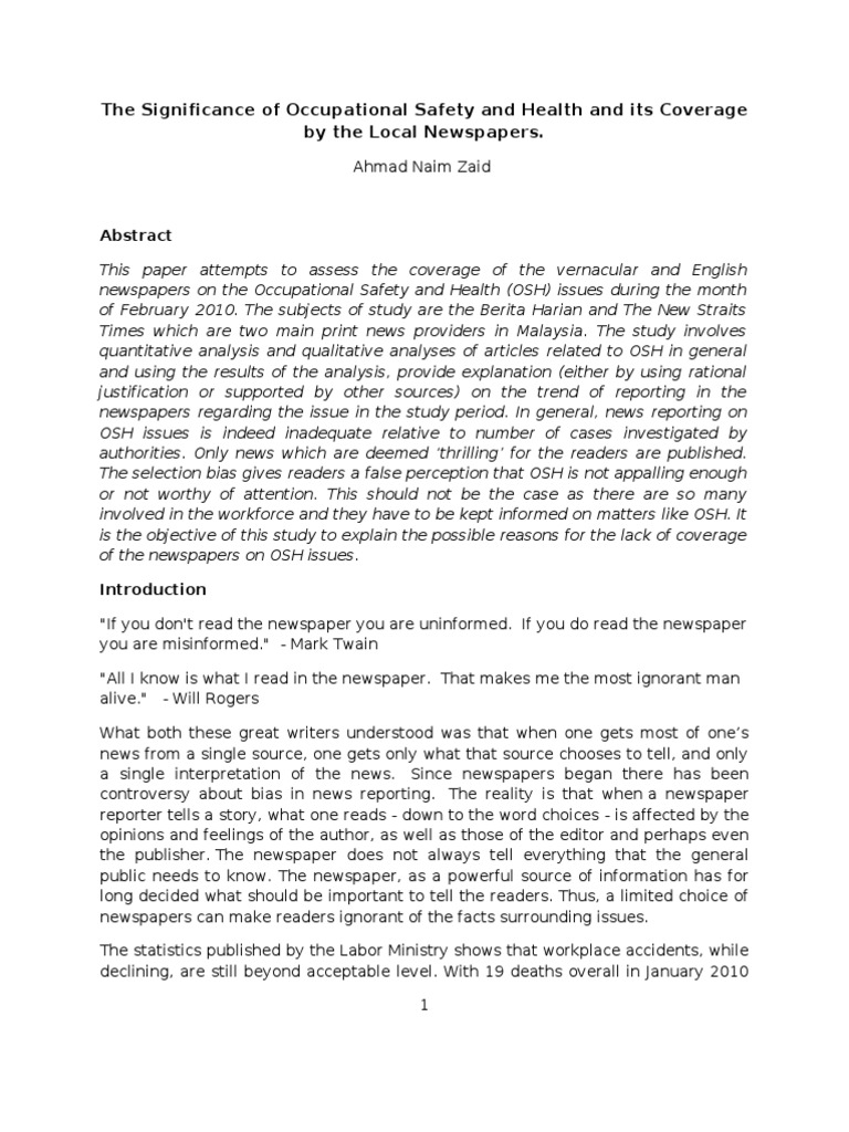 The osh act and the msi act require identication and assessment of them and implementation of control measures to prevent or minimise exposure. • niosh malaysia government own osh services provider agency • niosh. Shall comply with occupational safety and health standards promulgated under this act. Describe the role of the following agencies under ministry of human resources in supporting the implementation of osh act 1994. Occupational safety and health act1994 (osha) (act 514) occupational safety and healthmanagement system (osh ms) occupationalhealth and safetyassessment system (ohsas). Occupational safety and health act (osh act) usa a comprehensive federal law regulating safety and health in the workplace, including ensuring that work environments are free of recognized health. • occupational safety and health act 1994 this article incorporates text from this source, which is in the public domain. Employers' obligations under the osh act. Some amendments have not yet been incorporated. Amendments to the occupational safety and health (osh) act 1994. U the primary goal of this law (osh act) is to reduce workplace hazards and implement safety and health programs for both. An act to make further provisions for securing the safety, health and welfare of persons at work, for protecting others against risks to safety or health in connection with the activities of persons at work. (i) department of occupational safety and health (dosh) (ii).