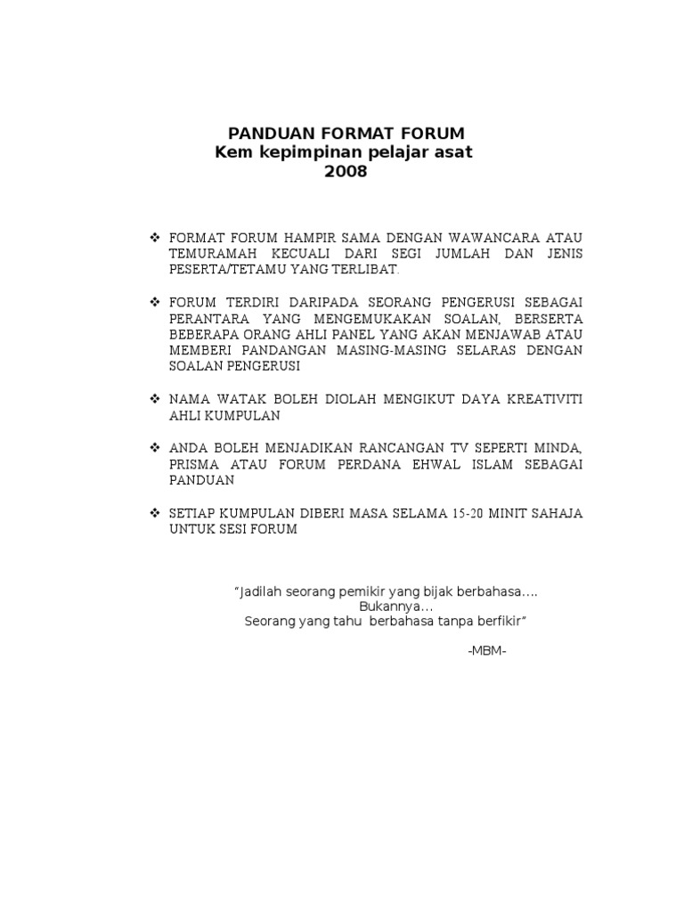Bismillahhirahmannirrahim, assalamualaikum warahmatullahi wabarakatuh warga dewan sekalian, bertemu kita lagi dalam gelanggang forum remaja. Sila download menggunakan link yang telah pelaksanaan format instrumen peperiksaan ini bermula tahun 2021 manakala pelaksanaan ujian lisan berasaskan sekolah (ulbs) bahasa melayu. Pertunjukan forum pengguna smf malaysia / melayu. Format karangan berpandu keperluan soalan. Format dokumen mudah alih (bahasa inggeris: